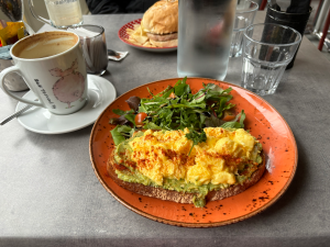 I had been hankering for brunch on our last day in the city, so a quick Google search gave us plenty of options close to our hotel (it was raining pretty hard and we didn’t fancy paying for a taxi into town). We picked The Cheeky Piglet after a few minutes scouring reviews and weren’t disappointed! It’s quite a small space, but they do have a covered section outside the main building for when the inside is full. It was when we got there, so we were sat under a heater in the ‘outside’ bit. S ordered their famous breakfast bap with Irish streaky bacon, and I really fancied the avocado and egg toast (with a cappuccino, of course). The coffee arrived piping hot, which was a welcome change to the usual lukewarm ones elsewhere! S devoured his bap is 0.3 seconds and I won’t lie, I was a little envious of his choice. The avo-egg toast was delicious and the buttery eggs scrambled to perfection.